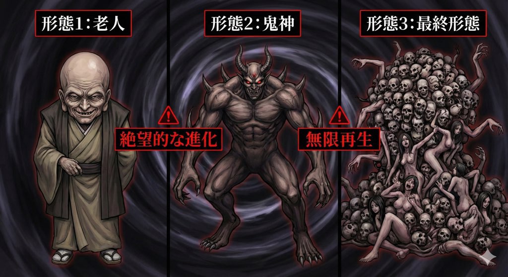 - 形態変化:ダメージを受けるたびに、より強力でグロテスクな姿へ変貌する